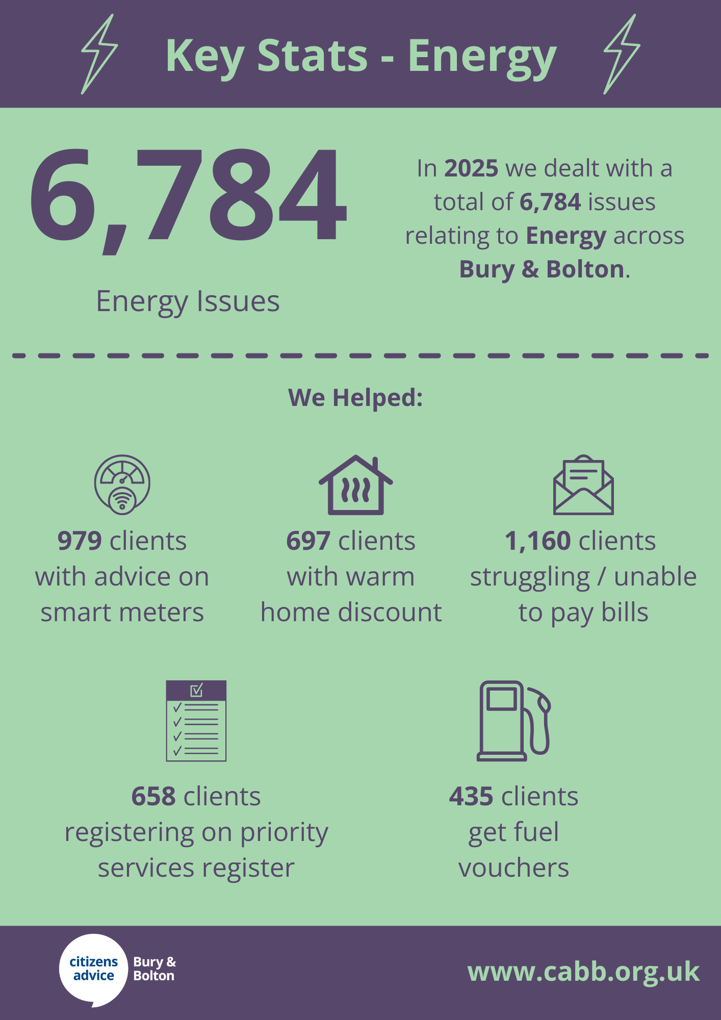 Throughout 2025, we supported 6,784 clients with a wide range of energy-related issues. This included advice on smart meters, the Warm Home Discount, help for those struggling to pay their bills, registering for the Priority Services Register, access to fuel vouchers, and much more.